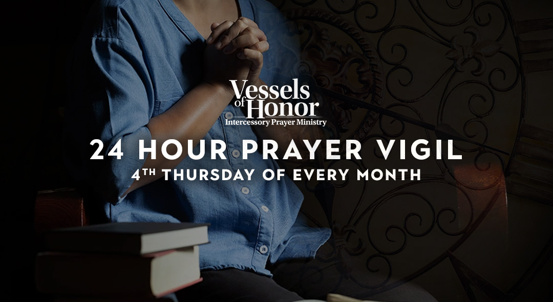 Vessels of Honor Intercessory Prayer Ministry (VOH) hosts its monthly virtual 24-Hour Prayer Vigil for the month of October. Dates: Thursday, October 23, 2025 Start Time: 6:00pm CST on Thursday, October 23rd End Time: 6:00pm CST on Friday, October 24th Location: Virtual This event is hosted every 4th Thursday of the month, each month.